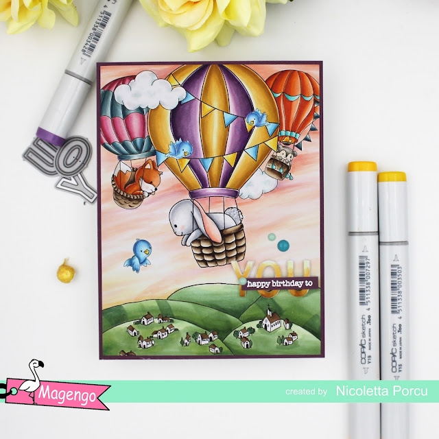 I left the background in black and white and I added it on the white base cardstock; the extra cookie is colored with Copic markers and added on the card using the foam pads to give some dimension.
