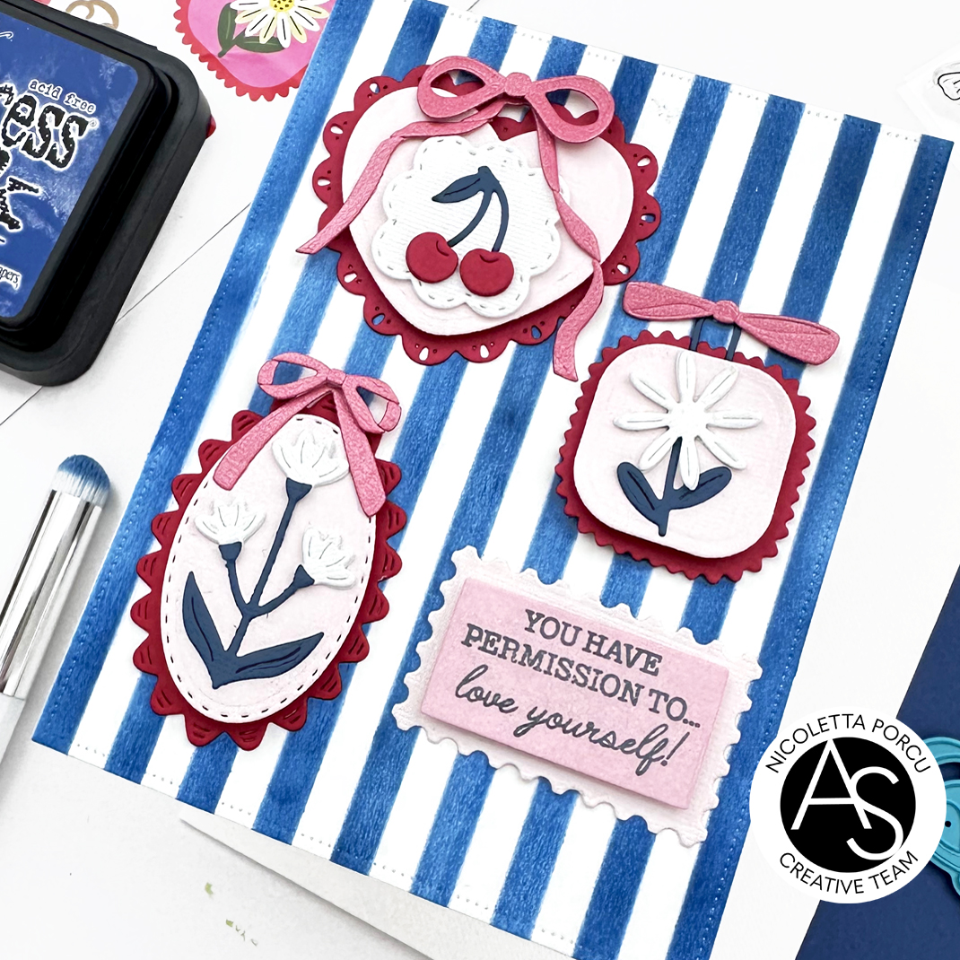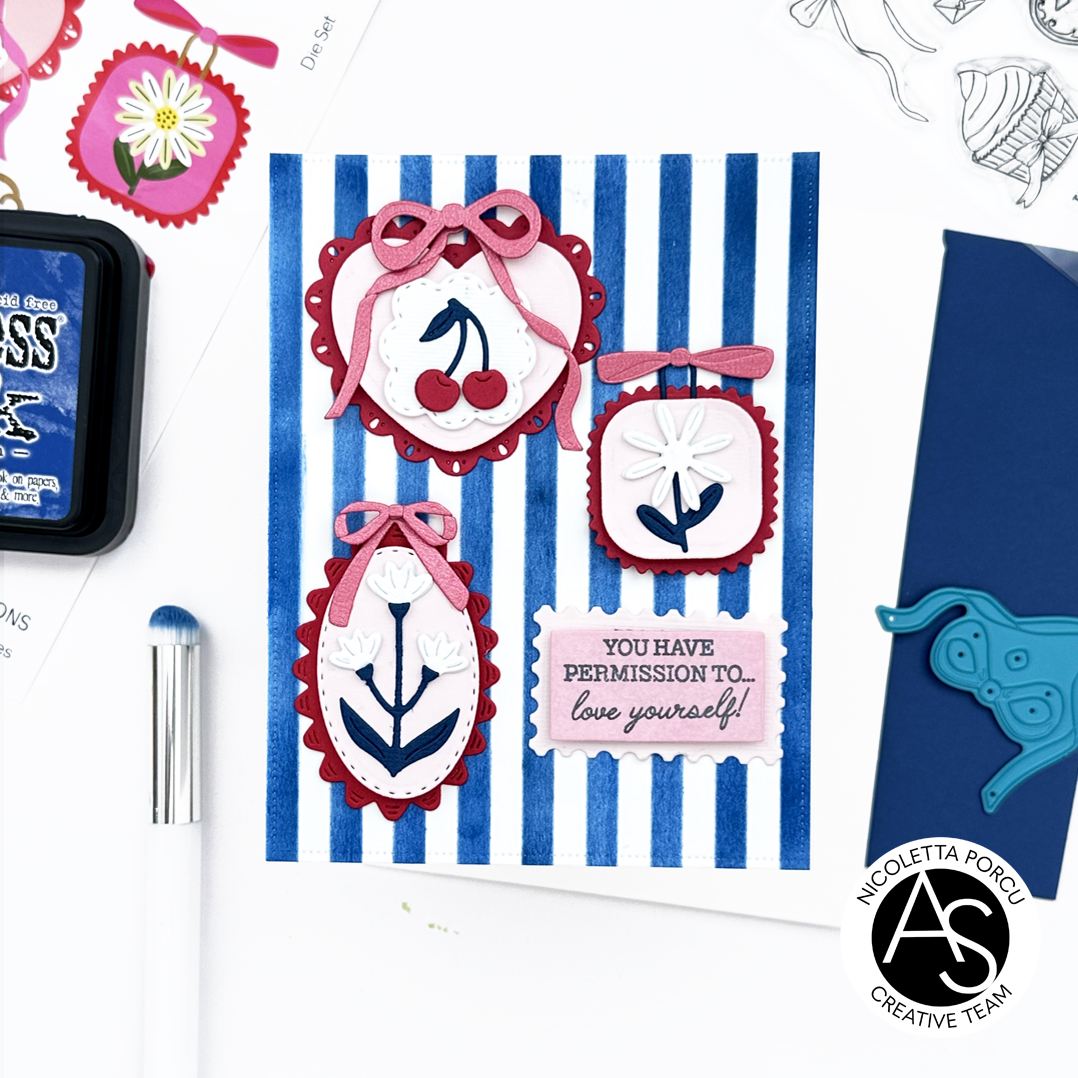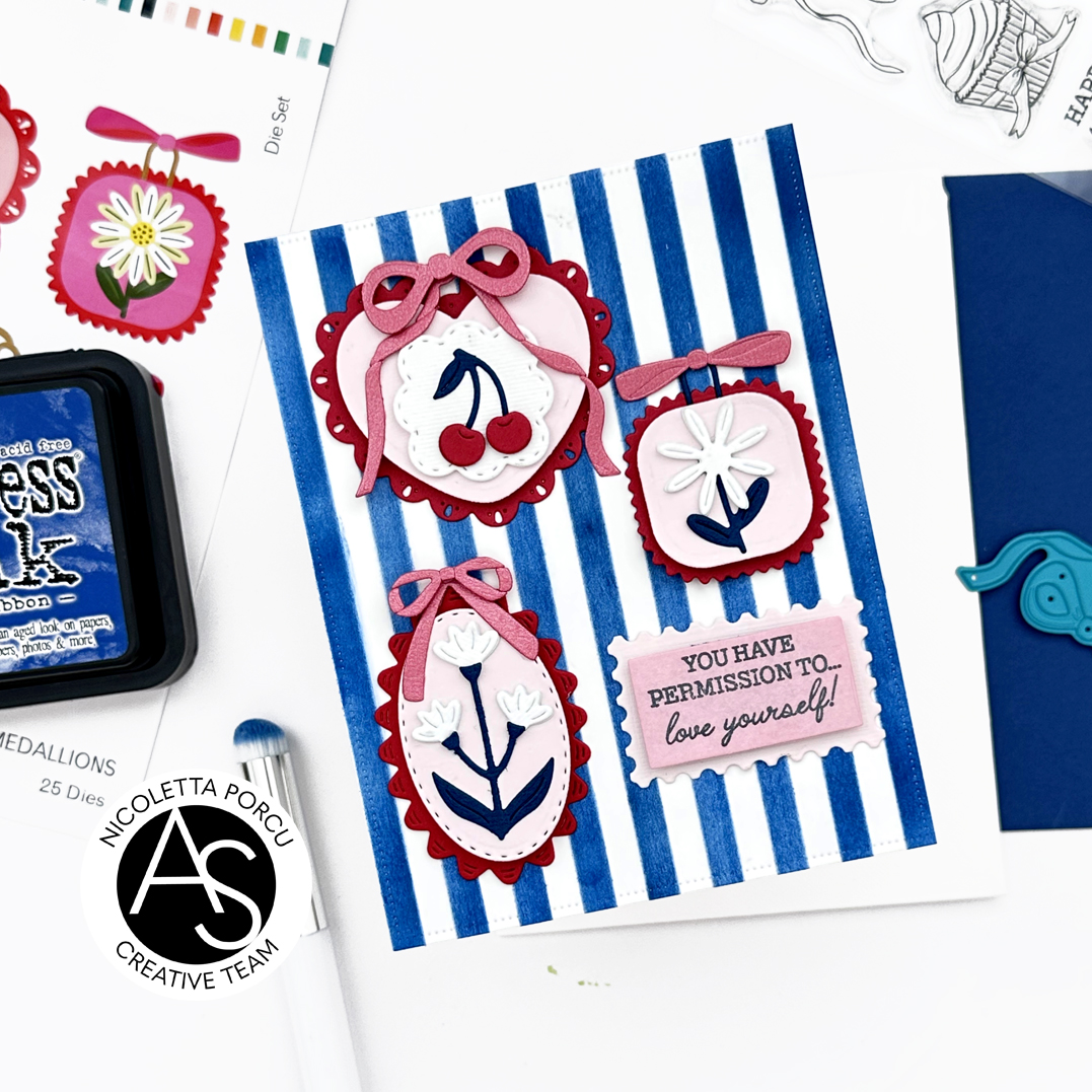 Next up I die cut all the elements I needed from the Charming Medallions die set and I glued everything over the stripes background.