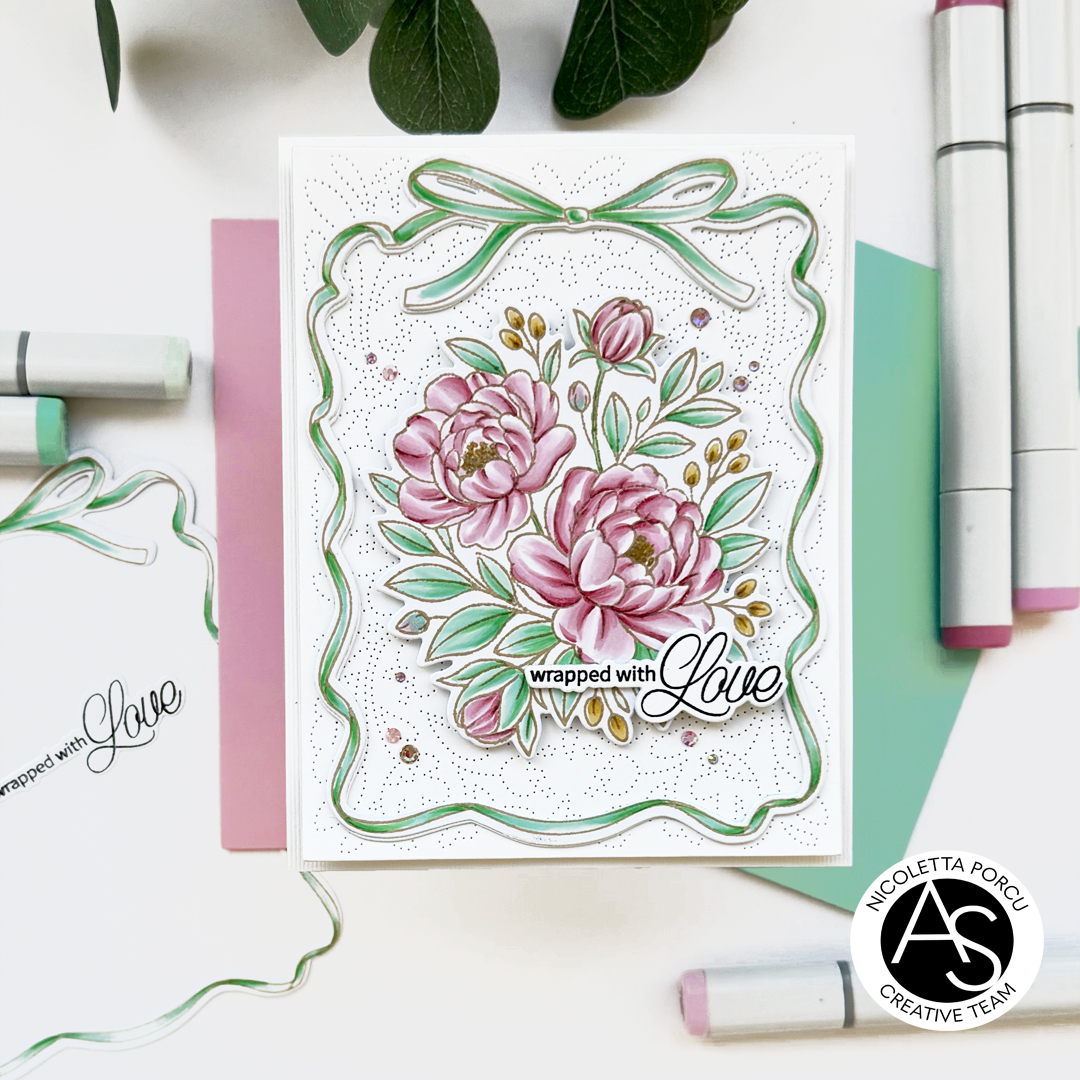Next up I stamped the ribbon frame and the floral bouquet , from the Wrapped With Love stamp set, on the Perfect Coloring Paper, and then I colored everything with my Copic markers. As I finished I die cut them using the Wrapped With Love die set and I placed them on the card.
